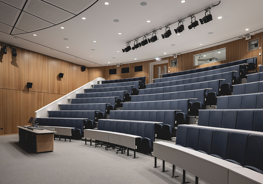 The building has been planned to support a wide range of teaching, learning, and engagement activities. It accommodates nine lecture theatres-including a 250-seat conference theatre-alongside general teaching rooms, collaboration areas, and social learning spaces. The arrangement promotes interaction between departments and offers flexible settings that can respond to evolving pedagogical needs.